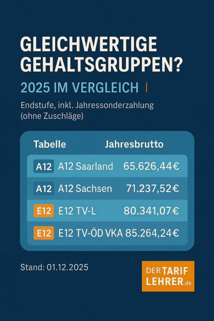 Wie ist das jetzt bei den Tarifbeschäftigten? Es gilt hier nicht die Tabelle A sondern die Entgelttabelle E nach TV-L (https://www.dbb.de/arbeitnehmende/entgelttabellen.html) und diese Liste gilt für die Angestellten im Öffentlichen Dienst der Länder deutschlandweit. Im Moment noch die mit Stand Oktober 2025, denn es findet ja gerade die neue Tarifrunde statt. Zum Vergleich: hier beträgt die Endstufe in E12 80.341,07€, ebenfalls brutto. TV-ÖD siehe Tabelle.