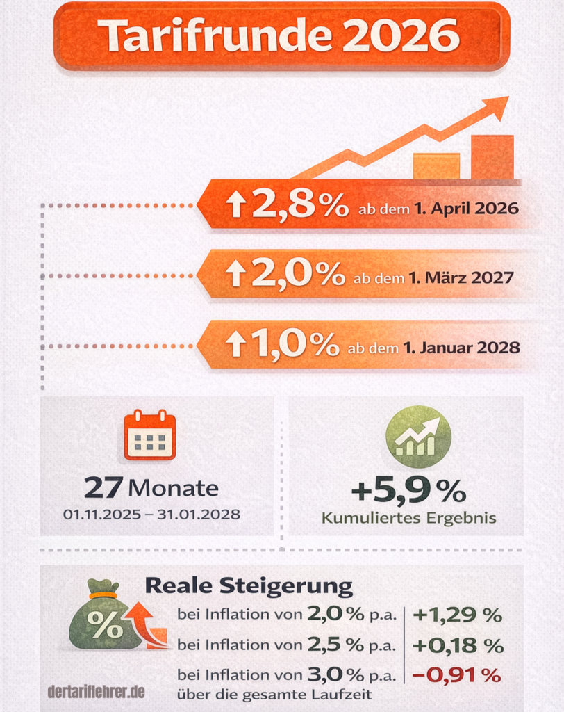 Insgesamt (wenn man es fälschlicherweise einfach addiert) entsteht so die Zahl 5,8% und damit der Schulterschluss zum TV-ÖD, was schonmal ein wichtiges Zeichen ist (wenn auch nicht ganz korrekt, kumuliert über die gesamte Laufzeit vom 01.11.25 bis 31.01.28 kommen sogar 5,9% raus).