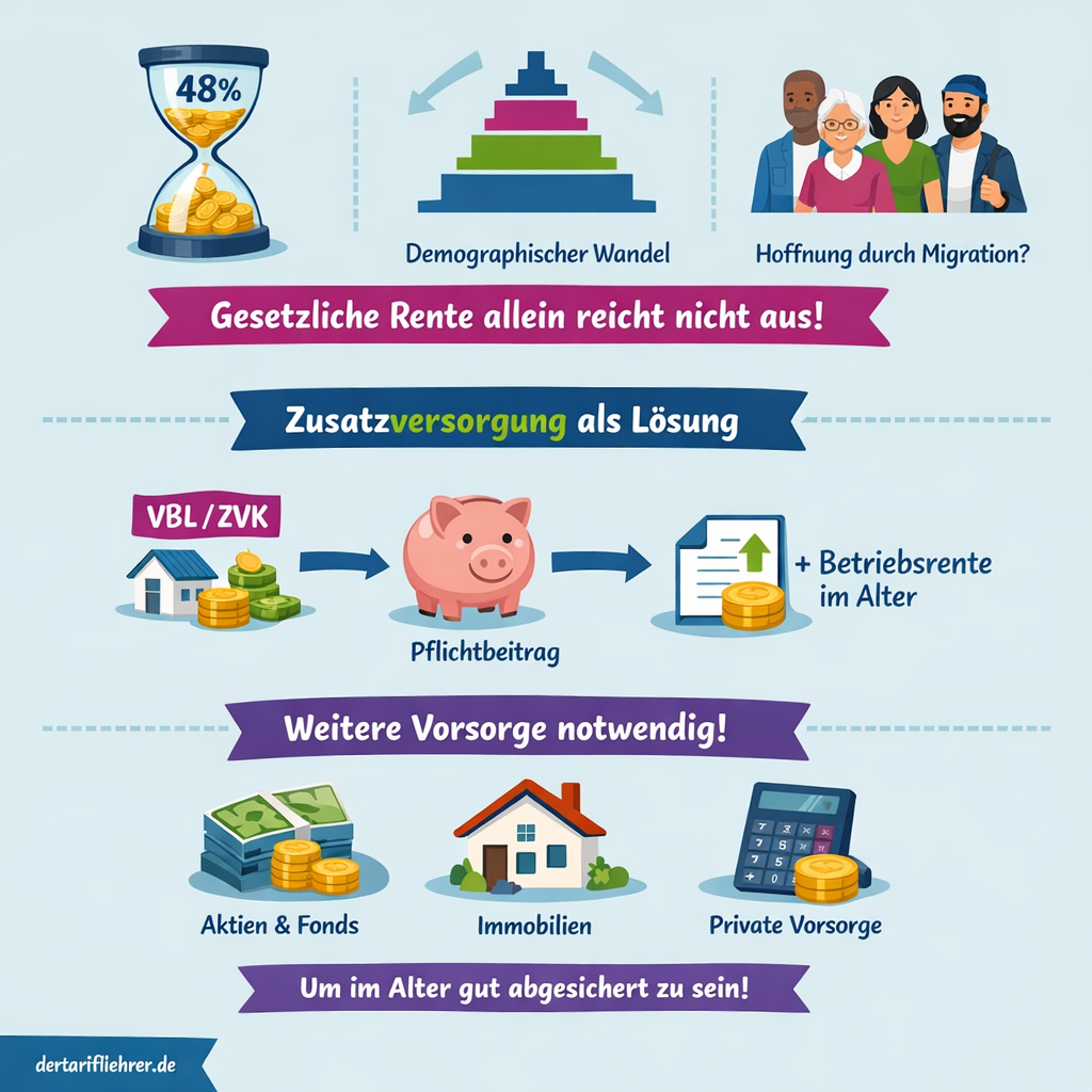 Die realistischste Variante dürften weitere individuell finanzielle Konzepte zur Zusatzversorgung sein. Hier haben die Tarifpartner im TV-L und im TV-ÖD bereits ein Konzept eingeführt, welches allerdings nicht alternativ sondern obligatorisch also verpflichtend ist: die Zusatzversorgung über die VBL oder ZKV. Je nachdem, ob kommunal oder im Länderbereich, zahlen also die Beschäftigten einen Anteil ihres Bruttogehalts in eine Versicherung zur Zusatzversorgung, um die gesetzliche Rente im Alter aufzustocken.